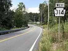 When routes were first legislated in Pennsylvania in 1911, what is now PA 314 west of Swiftwater was designated as part of Legislative Route 171.[4] The segment of road between Pocono Summit and US 611/PA 2 in Swiftwater became the easternmost part of PA 15 in 1927; a year later the route was renumbered to PA 115.[5][6] The section of PA 115 between PA 615 in Pocono Summit and US 611 in Swiftwater was a paved road, while the road east of Swiftwater was an unnumbered, unpaved road.[7] In 1935, PA 940 replaced the PA 115 designation between Pocono Summit and Swiftwater.[8] The unnumbered road east of Swiftwater was paved in the 1930s.[9] PA 314 was designated to its current alignment between PA 940 and PA 715 in 1964, replacing the PA 940 designation between Pocono Summit and Swiftwater. PA 940 was rerouted at Pocono Summit to head east through Mount Pocono to Paradise Valley.[10]