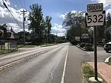 The Bustleton and Somerton Turnpike, a turnpike, was incorporated on April 14, 1840, running through present-day Northeast Philadelphia.[5] In 1872, the Bustleton and Somerton Turnpike was combined with the Richborough and Feasterville Turnpike Road to form one continuous turnpike.[6] The city of Philadelphia approved renaming the Bustleton and Somerton Turnpike within the city to Bustleton Avenue in 1903.[7] When Pennsylvania legislated its state highways in 1911, what would become PA 532 was legislated as part of Legislative Route 252 between Newtown and Yardley.[8] In 1928, PA 532 was designated to run from US 1 in Northeast Philadelphia north to PA 32 in Yardley, following its current alignment to Newtown, where it turned east and ran to Yardley. The portion of the current route between Newtown and Washington Crossing was designated as PA 632.[9][10]
