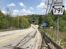 PA 791 heads north from the southern terminus on Rodi Road, passing through suburbs.[2] At the terminus, the road continues in both directions as US 22 Business and as part of the Yellow Belt[3] Shortly after the intersection, it heads under Interstate 376 and receives traffic from exit 80. Two miles to the north, it ends at PA 380 in Penn Hills at a shopping plaza.[2]