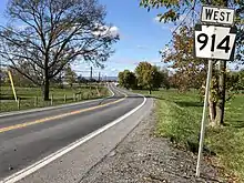 Pennsylvania Route 914 (PA 914) is a 4-mile-long (6.4 km) state highway located in Franklin County, Pennsylvania. The western terminus is at U.S. Route 11 (US 11) in Guliford Township. The eastern terminus is at PA 316 in Guilford Township. PA 914 heads southeast from US 11 on two-lane undivided Swamp Fox Road, passing through Marion and coming to an interchange with Interstate 81 (I-81). The route heads into Antrim Township, where it turns northeast and heads back into Guilford Township to come to its terminus. Swamp Fox Road was paved in stages, with the entire length paved in the 1940s. PA 914 was designated onto its current alignment in the 1960s.