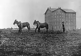 The school, initially named Farmers High School of Pennsylvania and sponsored by the Pennsylvania State Agricultural Society, became a degree-granting institution on February 22, 1855,[17] by the Pennsylvania General Assembly and initially named Farmers' High School of Pennsylvania.[18] The use of "college" or "university" was avoided in its name because of local Pennsylvania perceptions that such institutions were impractical in their courses of study. James Irvin of Bellefonte, Pennsylvania, donated 200 acres (0.8 km2) of land in Centre County,[18] representing the first of 10,101 acres (41 km2) the school eventually acquired. In 1862, the school's name was changed to the Agricultural College of Pennsylvania. The following year, in 1863, the Morrill Land-Grant Acts was passed by the U.S. Congress, and Pennsylvania selected the school to be the state's sole land-grant college.[18] The school's name changed to the Pennsylvania State College in 1874;[18] enrollment fell to 64 undergraduates the following year as the school tried to balance its primary focus on agricultural studies with a more classic education.[19]