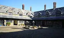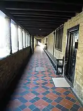 Founded in 1627, the almshouses have an ambitious symmetrical front with projecting centre and corners. The receding parts have one-storeyed colonnades of roughly hewn circular granite pillars, the front of which are in line with the projecting parts. The latter are gabled. The doorway is four-centred, the side parts with large four-light "posthumously Perpendicular" windows. There is a spacious courtyard behind with four ranges of almshouses arranged facing onto a large courtyard, with a passageway through from the street and another at the rear, leading to allotments.[1][7]