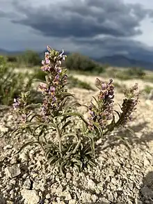 Penstemon barnebyi is a species of penstemon known by the common names White River Valley beardtongue and Barneby's beardtongue. It is native to the mountain and basin territory of central western Nevada, where it grows in sagebrush and woodland; there is also one occurrence just over the California border.[1] This is a hairy perennial herb with erect branches reaching 30 centimeters (1 ft) in maximum height. The oppositely arranged leaves are lance-shaped and up to 7.5 centimeters (3 in) long. There are usually several located around the base of the plant. The inflorescence produces tubular flowers just over one-half centimeter (14 in) long. They are light purple with a purple-striped white throat lined with yellowish hairs. The protruding staminode is covered in bright orange hairs.