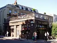 The Castle is a pub at No. 54 Pentonville Road, at the junction with Baron Street. In 2015, the perpetrators of the Hatton Garden safe deposit burglary met at the pub to discuss the crime shortly after it occurred, but were secretly filmed there by the Flying Squad. All were subsequently arrested and sent to prison. The current owners, Geronimo Inns, wish to distance themselves from the burglary and forbid staff to discuss it with customers.[24]
