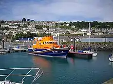 In 1991, a D-class (EA16) inshore lifeboat (ILB) was stationed on the opposite side of Mount's Bay at Marazion (although it was actually kept at St Michael's Mount). It proved difficult to find enough volunteer crews in this small village, so in 2001 the station was closed and a larger B Class boat was added to the complement at Penlee,[8] with a new boathouse built to house it. The following year a new pontoon was built in Newlyn harbour so that crews could board the ALB more easily.[8]