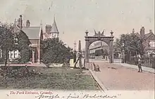 In 1884 two large arched entrance gates at the two junctions to Park Drive and Welholme Road were erected with a plaque detailing the gift of the land by Heneage. These dramatic entrance features were built be Young & Akridd of Hull for £150 per set in 1884. The gates unfortunately were removed in 1943 due to the war effort. It is believed the gates were a standard design produced by Grahamston Iron Company Ltd, Falkirk, Scotland. The entrance gates provided a grand entrance to the houses built facing the park and gave a feeling of privacy to the residents. In 1887 a Glass House was built, which today has been replaced by the Floral Hall, while in 1889 a drinking fountain was installed, paid for by public subscription. In 1894 the Smethhurst Memorial was unveiled. This commemorates Alderman Henry Smethurst (1819–1892), Mayor of Grimsby in 1886 and 1887. The monument is Grade II listed.[3]
