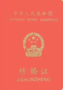 The People's Republic of China Marriage Certificate (Chinese: 中华人民共和国结婚证) is a legal document issued by the Chinese marriage registration authority to prove the valid establishment of a marriage. There are two official marriage certificates, one for each man and woman.[1]