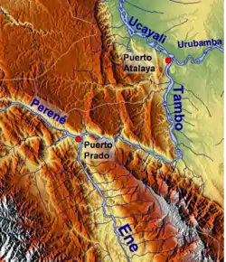 The Perené joins the Ene River, 10 km (6.2 mi) below the community of Puerto Ocopa, at 400 m (1,300 ft) above sea level, and is called the Tambo River from then on.