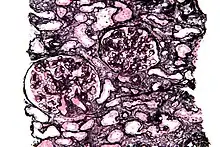 Micrograph of a kidney biopsy stained with a Jones stain.