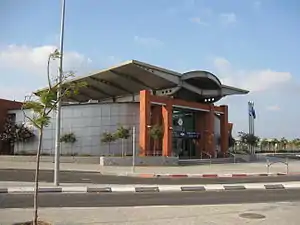 The Petah Tikva-Kiryat Aryeh railway station is a suburban passenger railway station in Israel, operated by Israel Railways. It is located in the northern Kiryat Aryeh business area and industrial zone of Petah Tikva, and mainly serves commuters from other towns who work in Petah Tikva. The station is adjacent to HaMoshava Stadium. It consists of a passenger hall and two side platforms serving two tracks on the Yarkon Railway. Space exists to allow converting the far side platform to an island platform, allowing the station to serve a total of three tracks in the future.