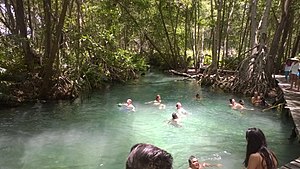 'Peten mangroves' are a particular type of mangrove association of plants, featuring irregular hummocks of non-mangrove tree species within the regular mangrove. The ecosystem draws freshwater from openings in the underlying karst, mixing with saline seawater. The coast along the western side of the Yucatan peninsula is within the Los Petenes Biosphere Reserve.[5][6]