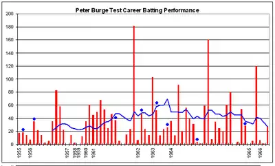 Burge started the 1962–63 season with a half-century against New South Wales and 115 against Western Australia, but his formed tapered away at the start of the 1962–63 Ashes series against Ted Dexter's England.[5] He made 6 in the first innings and was 47 not out when Benaud declared in the second innings of the drawn First Test in Brisbane.[5][6] Burge then made 23 and 14 in the second innings as the hosts were defeated by seven wickets, and he was again dropped from the team.[3][5] He returned to Queensland and scored 163 and 24 not out, and 33 and 54 not out in two matches against South Australia to earn a recall for the Fifth Test in Sydney. With the series tied at 1–1, Australia played conservatively for a draw and retention of the Ashes. Burge made 103 and 52 not out, to ensure a draw and a series victory. He headed the Australian Test averages with 245 runs at 61.25.[3][9] Despite ending the Shield season with four consecutive scores of no more than 10, Burge finished the season with 787 runs at 52.46.[5]