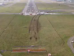 Path of G-YMMM from first ground contact until it came to rest in the taxiway at the corner of the approach end of runway 27L. Note the red ILS antenna array in the foreground, which was narrowly missed by the aircraft.