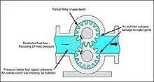 Illustration of cavitation in the high pressure fuel pumps used in the Trent 800 engines on the Boeing 777. When fuel flowing into the pump falls to very low pressure, gas bubbles form in the fuel. Bubble collapse on the high pressure side can cause damage to the pump's outlet ports.