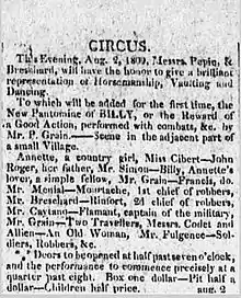 Born in France,[1] Grain was originally a performer and playwright with the Circus of Pépin and Breschard,[2] a company which toured the United States from 1807 until 1815.[3] On August 2, 1809, Pépin and Breschard presented his play Billy, or the Reward of a Good Action in New York City. This "New Pantomime" included "combats" on horseback, making it an early example of hippodrama. Grain was cast as the title character. His billing as "Mr. Grain" can be seen in other advertisements for the company's 1809 season.[4]