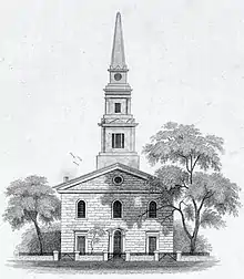 In 1793, Stuyvesant sold the property encompassing the Stuyvesant family chapel to the Episcopal Church for $1,[8] stipulating that a new chapel be erected to serve Bowery Village, the community which had coalesced around the Stuyvesant family chapel.[9] His great-grandfather had purchased the land from the Dutch West India Company and in 1651 and, by 1660, had built the family chapel. The elder Stuyvesant was interred in a vault under the chapel following his death in 1672.[10][11] In 1795, the cornerstone of the present day St. Mark's Church was laid, and the fieldstone Georgian style church, built by the architect and mason John McComb Jr., was completed and consecrated on May 9, 1799.[10] Alexander Hamilton provided legal aid in incorporating the church as the first Episcopal parish independent of Trinity Church in New York City.[9]