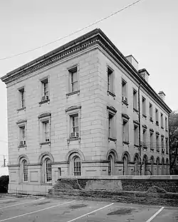 The Petersburg Custom House & Post Office is located on the southeast corner of Tabb and Union streets on a plot of ground purchased April 18, 1856, for the sum of $15,000.[3] It is a three-story, three bay by eight bay, Italian Renaissance Revival style brick building faced in granite. It measures 46 feet wide and 100 feet deep and was expanded to its present size in 1908-1910.