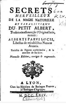 Petit Albert (English: Lesser Albert) is an 18th-century grimoire of natural and cabalistic magic.[4][5] The Petit Albert is possibly inspired by the writings of Albertus Parvus Lucius (the Lesser Albert).[6][7] Brought down to the smallest hamlets in the saddlebags of peddlers,[3] it represents publishing success, despite its association with "devil worshipers"[8]—or rather because of it. It is associated with a second work, the Grand Albert. It is a composite, heterogeneous work, collecting texts of value written by various authors; most of these authors are anonymous but some are notable such as Cardano and Paracelsus. Due to its historical nature, Albertus Magnus' attribution to the text is considerably uncertain and since the text quotes from many later sources, it is an ethnological document of the first order.