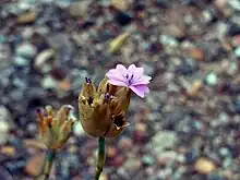 Petrorhagia nanteuilii is a species of flowering plant in the family Caryophyllaceae.[1] Common names include childing pink,[2] productive carnation, proliferous pink and wild carnation.[3] P. nanteuilii in the British Isles was formerly not reliably separated from P. prolifera but now the two are recorded as separate species.[4] Because of this the commonly used name proliferous pink is probably not correct for this taxon. It is an annual that grows to 50 cm tall. Leaves are linear, opposite and stem clasping. Small pink flowers are produced in small ovoid heads, with usually only one flower visible at a time. These are followed by ovoid seed capsules.[5]