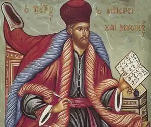 The name "Bereketis" is derived from the Turkish word "bereket" (literally "abundance") with which he was known to reply to his students' eager requests for more kalophonic heirmoi or other mathemata to study. Already Balasios the Priest had made the heirmos kalophonikos to one of the most important genres of Ottoman Greek music.[4] This genre was paraliturgical and therefore more experimental than the kalophonic way to compose stichera, which was already established by Late Byzantine composers like John Koukouzeles and Manuel Chrysaphes.[5] The Ottoman collection of heirmoi kalophonikoi became more popular than the Byzantine stichera kalophonika within the living tradition of Orthodox chant, and it was published in the transcription of Gregorios the Protopsaltis by Theodoros Phokaeos.[6] But there are handwritten heirmologia kalophonika notated in exegetic neume notation whose collection are not in every respect identical.[7]