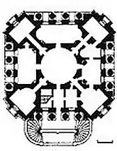 A new house was built in brick faced with stone in 1776-80. The main house was similar in design to the Villa Capra but with canted corners. It has an octagonal main block of two storeys, with a cupola on a round central drum above a central circular hall. The estate is situated on a hill, with the main façades facing northwest, northeast, southeast and southwest. Each of the four main façades was dominated by a loggia decorated with four giant Tuscan columns spanning both main floors, with entablature and cornice above. Each canted corner had a single-storey entrance portico with two Ionic columns and balcony above, leading to a corner room, with diagonal corridors leading to the circular central hall.