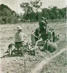 The Plough was fitted with lever and foot controls which operated four straight disc wheels. These were turned in and out of the trees as the operator desired. The wheels would sink into the ground about 2.5 inches, giving good control and preventing side slipping often associated with ploughing uneven surfaces. The cutting discs were on an extended floating arm, which followed the land they were working. Depth was regulated by two levers and the discs could be reversed to turn soil towards or away from trees.[2][3] Soil was turned towards the trees in autumn and away from the trees in spring. This facilitated drainage in the wetter months and conserved water in the dryer months.[1] The plough was manufactured in two types: light and heavy. The light weighed 7 cwt and the heavy 8 cwt 2 qrs.