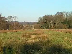 The wharf at Haslingbourne has entirely disappeared and an electricity sub-station and a former water treatment plant, which pumped water from springs at the foot of Gore Hill to Petworth, are on the site. The area is now used for storage of construction machinery. Below Haslingbourne Cottages the stream flows in the canal bed which is cut through sandstone beds, creating a shaded artificial gorge rich in mosses and lichens. Emerging from this cutting at the site of Upper Lock the canal follows a straight course across low lying boggy ground, fenced off as a nature reserve area. Reaching the site of Haines Lock the stream can be heard pouring through a broken down weir in the undergrowth as it turns eastward into its natural course. The west bank of the canal here runs into the pasture for some twenty metres and the position of the levelled course beyond can just be discerned. Beyond the slightly higher ground here, as the Haslingbourne Stream again comes close to the canal, the embankments can be seen forming a straight line across the floodplain to the river. A pond near the river is the site of a weir and tumblebay.
