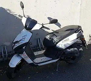 The Peugeot Streetzone is a scooter produced since 2013 by Peugeot Motocycles.[3] An electric version, named the Peugeot e-Streetzone, was unveiled at the 2022 Paris Motor Show and will be available from 2023 with one or two batteries and a maximum range of 112 km (70 mi).[4]