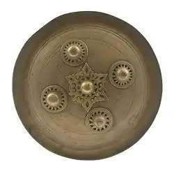 The Peurise Teumaga is made of cast brass or bronze. The decoration often consists of concentric circles made on a lathe using a chisel.[2] Common decorations of six hexagonal stars can also be found on this shield. A rope is attached behind the shield to function as the handle. The diameter of this shield is approximately 24 to 35 cm (9.4 to 13.8 in).