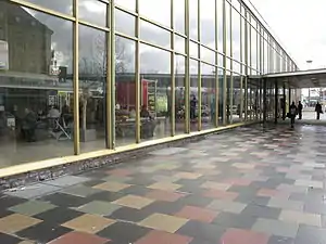 In the main hall there is a large wall relief by Josef Karl Huber,[7] on the theme of the "Gold City [Pforzheim] at the gate of the Black Forest" (Goldstadt an der Schwarzwaldpforte), which includes a dynamic pattern of swinging curves. The architect Conradi and the artist Huber had met in an English prisoner of war camp and spent two years together there.[10] The building has been described as "one of the finest and most modern station building of Deutsche Bundesbahn"[11] and has been listed as a cultural monument of the post-war period since 1989.[7] The listing was instigated by plans of Deutsche Bundesbahn to replace a counter by a travel centre on the ground floor of the station. The heritage office then placed the station under protection, so that the necessary alterations did not alter the original nature of the building.