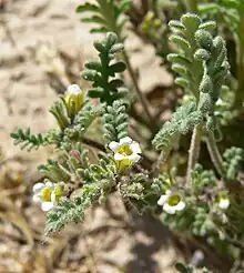 Phacelia ivesiana is an aromatic annual herb growing up to about 25 centimeters in maximum height. It has a branching, spreading, hairy stem which is often glandular. The leaves are up to 6 centimeters long and deeply lobed or divided into segments. The inflorescence is a cyme of bell-shaped flowers each only about 4 millimeters long. The flowers are white with tubular yellow throats. The fruit is a beaked capsule a few millimeters long.[4]