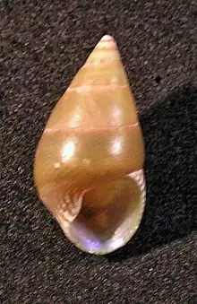 The height of the shell attains 20 mm. The imperforate, solid, smooth shell has an elongated conical shape. It is shining, grayish, or brownish-yellow, with numerous narrow, fine, crowded, obliquely longitudinal red lines. These are often hard to perceive on account of the golden and violet iridescence. The whole surface is microscopically spirally striate. The striae are coarser on the base. The 8 to 9 whorls are nearly flat. The upper whorls are pink. The acute spire is turreted, and straight sided. The sutures are linear, sometimes with a white margin. The body whorl is rounded at the periphery. The oval aperture is slightly exceeding one-third the total length of the shell. It is smooth and not sulcate. It is beautifully iridescent within. The columella has a subacute tooth below the middle.[2]
