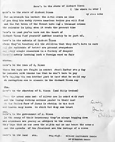 Ochs was having difficulties writing new songs during this period, but he had occasional breakthroughs. He updated his sarcastic song "Here's to the State of Mississippi" as "Here's to the State of Richard Nixon", with cutting lines such as "the speeches of the Spiro are the ravings of a clown", a reference to Nixon's vitriolic vice president, Spiro Agnew—sung as "the speeches of the President are the ravings of a clown" after Agnew's resignation.[101][102][103]