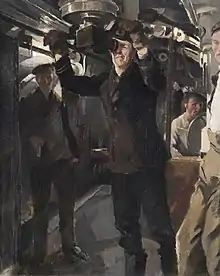 Although he was nearly 40 years old when the First World War broke out, Connard volunteered as a private, learned to ride, and fought in France as a member of a gun team in the Royal Field Artillery. He reached the rank of Captain before being invalided out because of severe shell shock. He was later appointed an official war artist to the Royal Navy and painted the surrender of the German ship SMS Goeben and the Zeebrugge raid.[2] This work for the Navy is in the Imperial War Museum in London.