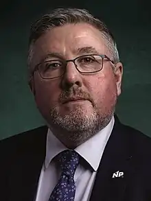 Dwyer faced criticism when he laid a wreath from “the Men of Ireland” at the grave of Ashling Murphy, the Tullamore schoolteacher who was killed in January 2022.[9] He then gave a speech at the graveside, saying Murphy's death had been “used as a weapon” by the government, media and NGOs to “distort the truth” about her killing.[9] Dwyer announced he had been expelled from the National Party due to his involvement in the stunt.[10][11] His departure was described in the Irish Times as part of "an internal quarrel".[11][2] The Phoenix reported that Dwyer was seen as a rival to Justin Barrett's leadership of the party, having "built up a vibrant following with his live-streaming and Men of Ireland hikes". It was reported that Barrett expelled Dwyer at a party meeting in the Killeshin Hotel, Portlaoise, in February 2022. This led to "rancour" and "some resignations".[12]