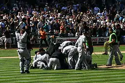 The Mariners went hitless for the third time in franchise history and this was the first time that no Mariner reached base.[40] However, they went on to pitch two no-hitters in 2012, both of which took place at Safeco Field and winning both games 1–0.[41] One of them was the first perfect game in franchise history, by Félix Hernández,[42] making them the first team to be on both the losing and winning end of a perfect game in the same season,[41][43] and marking the first time two perfect games were thrown in the same park in the same season.[44]
