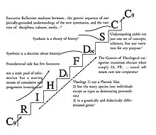 - ↑ Patrick Brown, “Editors’ Introduction,” Seeding Global Collaboration, p. xix. Cij is shorthand for a matrix of differentiated conversations between persons working in distinct functional specialties. McShane described the matrix in these words: “Cij, with i and j running from 1 to 8, represents the possible conversations, face to face or through journals, etc., between the community members. It is not difficult to imagine such conversations: between a textual researcher and a historian, between a phonologist and someone with a foundational perspective on neurophysiological possibilities, between an educator and an interpreter, and so on.” McShane, A Brief History of Tongue (1998), pp. 106–107. See also The Allure of the Compelling Genius of History, (2015), pp. 187–190. The meta-diagram W3 is a heuristic for a hoped-for collaboration between specialists who have intussuscepted the hylemorphism of Insight, especially chapters 8, 15, and 16. W3 was invented by McShane on a morning of a conference at Concordia University on Lonergan’s hermeneutics in November 1986. See A Brief History of Tongue, p. 124; Pierrot Lambert and Philip McShane, Bernard Lonergan: His Life and Leading Ideas, p. 161, and McShane, Prehumous 2, “Metagrams and Metaphysics.” The inner citation (†): "On commonsense eclecticism, see Insight, CWL 3, 441-445.