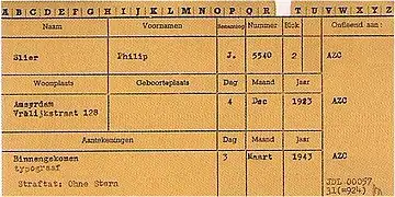 Philip "Flip" Slier (4 December 1923 – 9 April 1943) was a Dutch typesetter of Jewish origin who lived in Amsterdam during the German occupation of the Netherlands in World War II. At the age of 18, he received a letter from the Jewish Council of Amsterdam—under orders from the German occupiers—that he was to report to Camp Molengoot or face arrest. He wrote 86 letters from 25 April to 14 September 1942 detailing his experiences as a forced labourer at the labour camp. Eventually he escaped to Amsterdam and lived as an onderduiker (a person in hiding); he frequently disguised himself and moved to different hiding locations to evade detection.