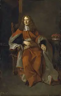 He had one surviving daughter, Elizabeth, by his first wife, Elizabeth Wandesford.[4] By his second wife, Jane, only daughter of Colonel Arthur Goodwin and heiress to the extensive Goodwin estates in Buckinghamshire, he had seven additional children: Anne, Margaret, Thomas Wharton, 1st Marquess of Wharton, Mary, Goodwin, Philadelphia, and Henry.[4] On 21 April 1658, his second wife Jane died and on 26 August 1661, he married for the third time. Lord Wharton married Anne Popham (née Carr), the widow of Colonel Edward Popham. Anne brought two children from her marriage with Edward: Letitia aged 13 and Alexander aged 12. Alexander was a deaf-mute and under the guidance of Dr. John Wallis in Oxford, was one of the first deaf people in the world to learn to speak. Lord Wharton and his third wife had a son named William, born around June/July 1662.[4] William died on 14 December 1687, killed in a duel.