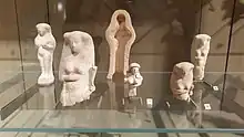 Archaeological evidence indicates that the sanctuary was built in multiple phases.[36] A temple was initially built between the Iron Age II and Persian period, but remains have not survived intact, indicating that it was likely constructed using perishable materials.[36][17] In the initial phase, the sacred area housed at least one cultic statue, supported by the discovery of a fragment from a small-sized statue dating to the first half of the 6th century BC, found 20 m (66 ft) northwest of the sanctuary favissa.[37] This statue resembles several examples of Cypriot cultic statues discovered among the materials of the favissa of the Phoenician temple in Amrit, but it remains uncertain whether the Kharayeb statue was imported from Cyprus or locally produced. The feet of another statue of a different iconographic type were found by Kaoukabani.[32] Cultic artefacts dating from the Iron Age II or Persian period were also discovered, these included figurines, small and miniature vases and pottery, and miniature altars.[38][39]