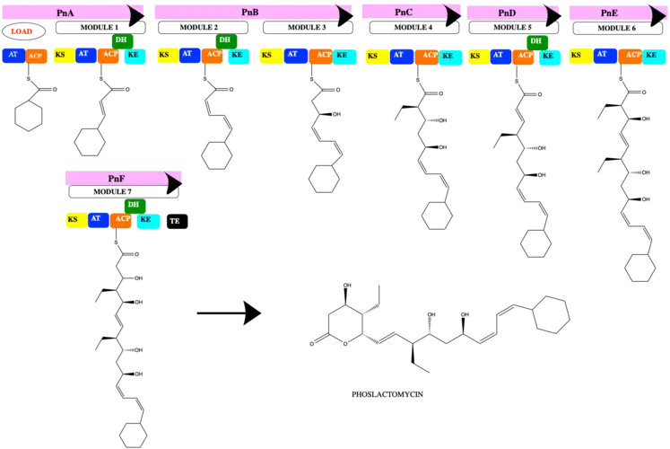 The PKS of phoslactomycin has one loading domain, 7 modules and 6 proteins that encode PnA, PnB, PnC, PnD, PnE, and PnF. The biosynthesis starts the loading with the cyclohexyl- CoA. Stepping in each module, there always need the keto synthase (KS) to create the new linkage of carbon-carbon to elongate the chain, the acyl transferase to transfer acyl to ACP domain. Then ACP serves as the acyl carrier protein to the further reaction, and each module has the keto reductase at the end to reduce the ketone to hydroxyl group with more stable. Module 1 uses the precursor malonyl-CoA and dehydrase domain to create the double bond.