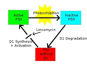 In photoinhibition studies, repair is often stopped by applying an antibiotic (lincomycin or chloramphenicol) to plants or cyanobacteria, which blocks protein synthesis in the chloroplast. Protein synthesis occurs only in an intact sample, so lincomycin is not needed when photoinhibition is measured from isolated membranes.[27] The repair cycle of PSII recirculates other subunits of PSII (except for the D1 protein) from the inhibited unit to the repaired one.