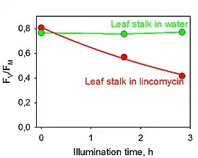 - 1 2 Tyystjärvi, E & Aro, E-M (1996). "The rate constant of photoinhibition, measured in lincomycin-treated leaves, is directly proportional to light intensity". Proceedings of the National Academy of Sciences of the USA. 93 (5): 2213–2218. Bibcode:1996PNAS...93.2213T. doi:10.1073/pnas.93.5.2213. PMC 39937. PMID 11607639.