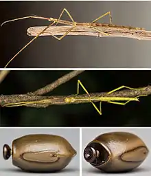 Phryganistria tamdaoensis is a species of stick insect belonging to the family of giant sticks. It was described in 2014 based on specimens from the Tam Đảo National Park in Vietnam, hence, the specific name tamdaoensis.[2] It was described by Joachim Bresseel and Jérôme Constant, biologists of the Royal Belgian Institute of Natural Sciences (RBINS). In the same paper they also reported the discovery of another new subspecies, Phryganistria heusii yentuensis, which – measuring 32 cm long – is the second biggest insect known to date.[3] In contrast, P. tamdaoensis, measuring only 23 cm long, is one of the smallest species under giant sticks.[4]