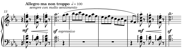 The brief introduction of the first movement (Sostenuto assai) resembles a hymn with four- and five-part harmony, all strings using double stoppings to achieve a chordal texture.[15] It leads to a more figural and abstract Allegro ma non troppo (mm. 13f.) that bears resemblance in its tone to Beethoven's "Harp" Quartet and Archduke Trio.[13] Three striking chords lead to a held dominant seventh, the right hand of the piano then presenting the first subject:[16]
