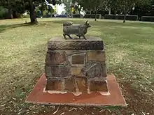 The "Puppy Memorial" to the mascot of the Toowoomba Thistle Pipe Band was erected in 1959 (not at its current location).[1] Since 1950, the band's drum major, Hugh Morgan, used his dog Puppy to lead the band in the annual Carnival of Flowers parade. Puppy wore a rug of the band's tartan and was a favourite with the public. During the 1958 parade, Puppy was hit by a car and killed; his death greatly saddened the community. The statue was stolen in 1983 and again in 1990 but was recovered on both occasions.[2][3]