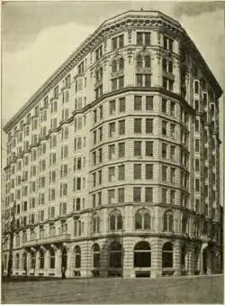 Construction on the Piedmont Hotel commenced in mid-1901.[8] The building was designed by Willis F. Denny, an Atlanta-based architect who designed several other notable buildings in the city, such as St. Mark United Methodist Church and Rhodes Hall.[9] Construction on the hotel lasted through 1902, and it opened to the public at noon on January 15, 1903.[8] The opening was a big event for the city, as thousands of people gathered to see the hotel's interior and prompting the Atlanta chief of police to dispatch officers to keep order.[10] That afternoon, The Atlanta Journal published a front page story on the opening, calling the hotel "the handsomest and most complete in the South".[8] While other hotels in the city, such as the Kimball House, had a reputation as institutions that maintained Southern customs, such as in the Southern cuisine offered in their eateries, the Piedmont instead sought to emulate the style of the hotels in the northeastern United States.[11] One way in which the Piedmont differed from other local hotels was that their staff of bellhops and chambermaids consisted entirely of white Americans, unlike in other hotels which often employed African Americans in those positions.[11] According to historian Franklin Garrett, the hotel was often referred to by locals as "our New York City hotel".[11] In 1906, Atlanta's first storefront theater, a nickelodeon called the Peachtree Theatorium, opened in the hotel's lobby.[1] The following year, a guide book called the Piedmont the largest hotel in the city.[12]