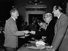After the Second World War he and Livio worked with their younger brother Achille, who had also graduated in architecture in 1944.[2] Much of their work was in product and exhibition design, but they also carried out a number of architectural projects,[5] including the reconstruction in 1952–53 of the Palazzo della Permanente, which had been destroyed by bombing in 1943.[1]