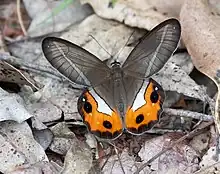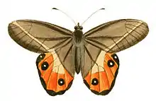 Underside: Palpi, legs, breast, and abdomen cream coloured. Anterior wings next the tips tinged with red brown; the remainder of the wings being of the same colour as on the upperside. Posterior wings next the body pale clay, which occupies half the wings; below which is a white bar, the remainder of the wings being dark orange: the two black eyespots are very small on this side, and the white spot above them not so distinct. These wings are larger than is generally observed among insects of this tribe, and are dentated, the anterior ones being entire. Wingspan 3 inches (76 mm).[3]