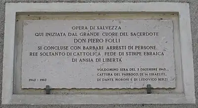 A nazi-fascist breaks punishment expedition breaks in the rectory and arrests don Piero Folli together with a group of 14 Jewish people sent from Genova archbishop Pietro Boetto, who had been just rejected form the Swiss at the border. Thirty other Jewish people, coming from Saint-Martin-Vésubie near Besançon, had already been saved in three or four trips, accompanied by Don Rotondi, but their names have not been found.[3]